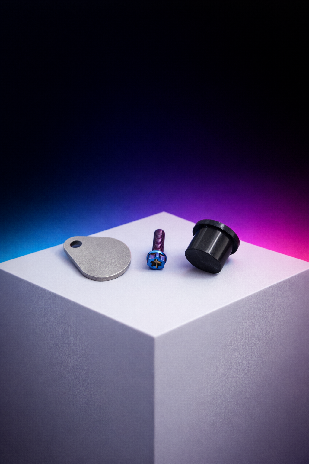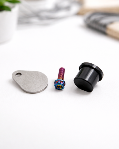 a steel hold-down plate for solid retention, a TPU plug designed to seal the pump port, and a titanium bolt for a premium, corrosion-resistant fastening solution.